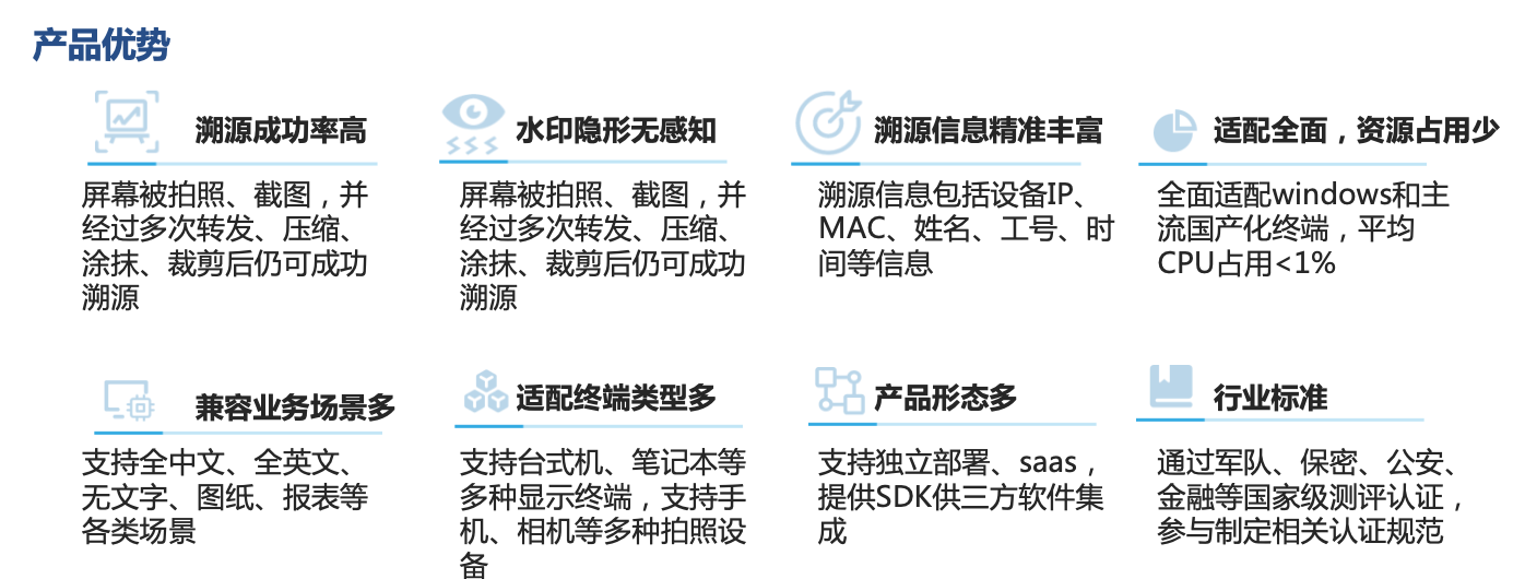 系统主要用于解决电子屏幕被拍照、摄录、截屏泄露后的快速溯源难题。通过“电-光-电”跨媒介隐形水印技术,在屏幕嵌入不可见的溯源信息,一旦出现因对屏幕拍照、摄录、截屏等造成的泄露,通过分析泄露数据中的隐藏信息,精准定位泄露源头,形成巨大震慑,实现屏幕数据安全管控目的。